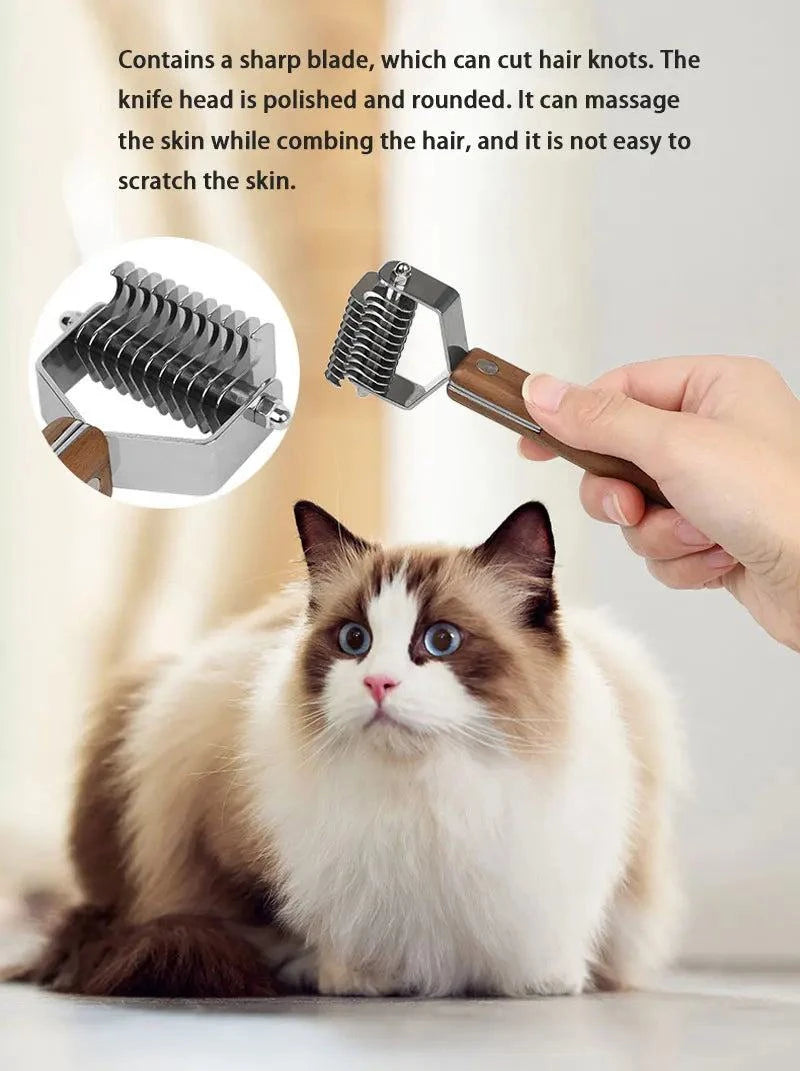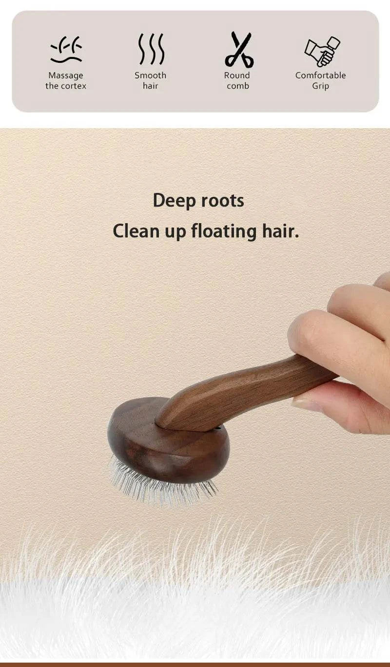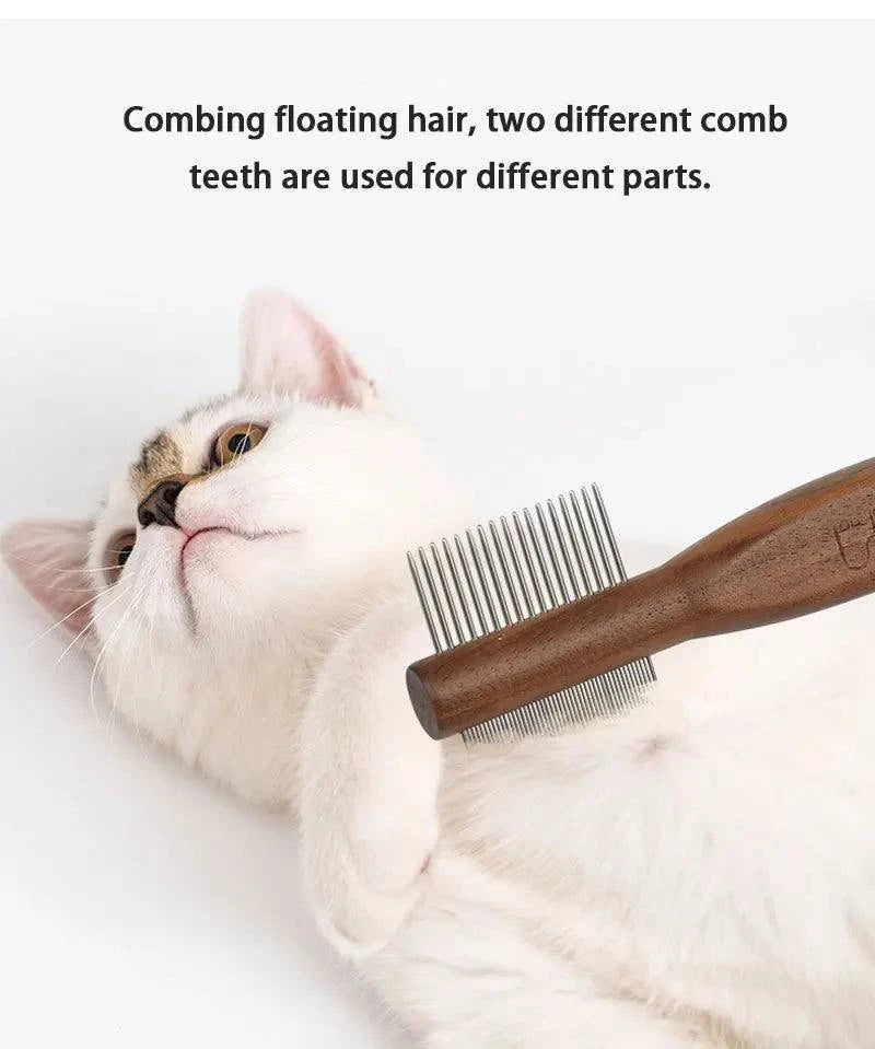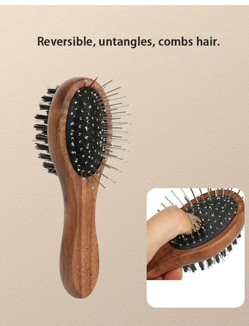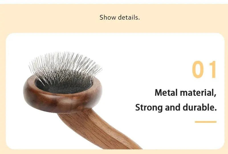 Eco-friendly pet grooming brush with wooden handle and metal bristles for detangling.