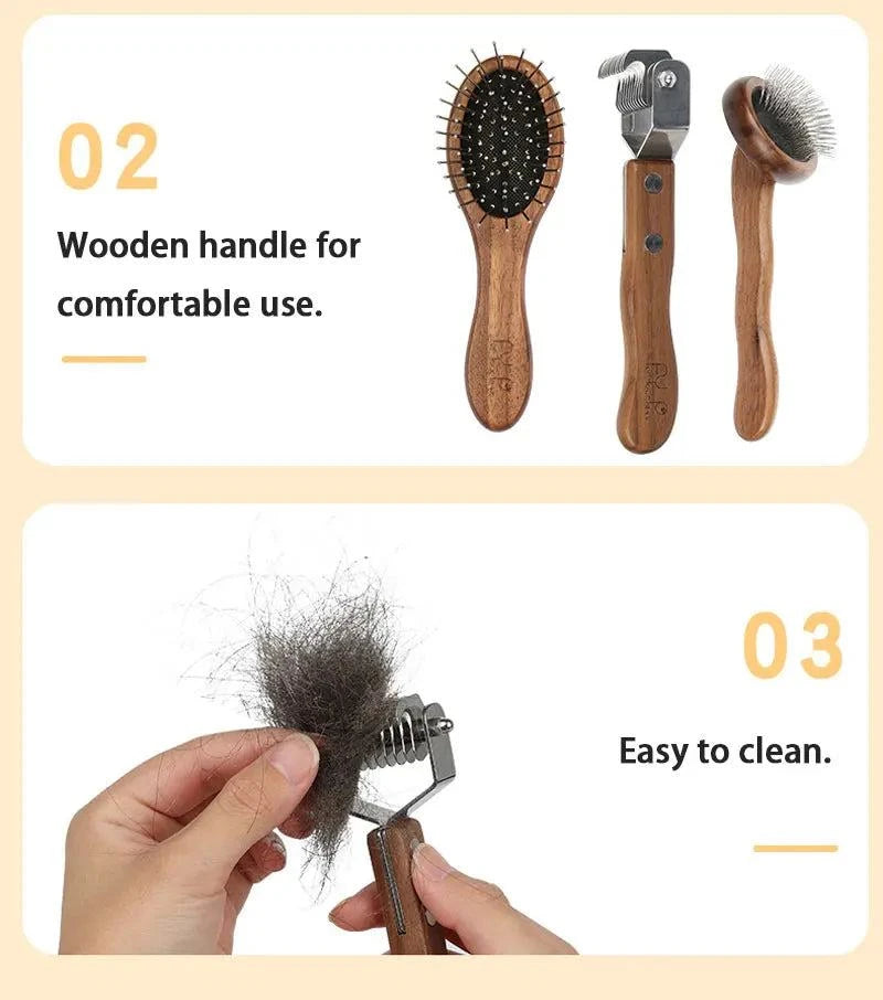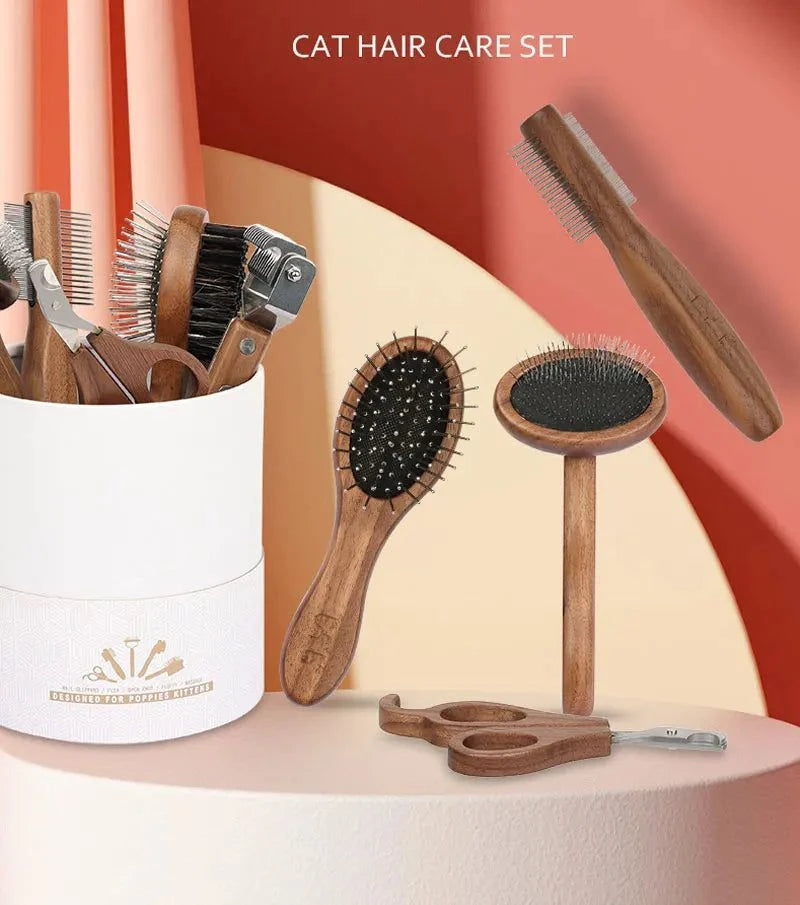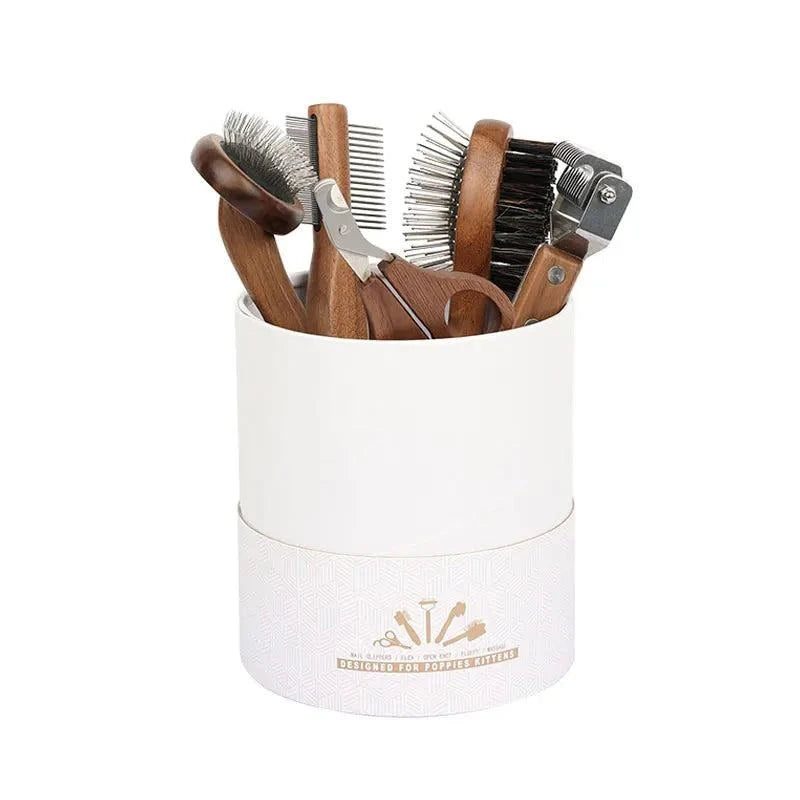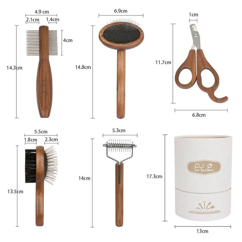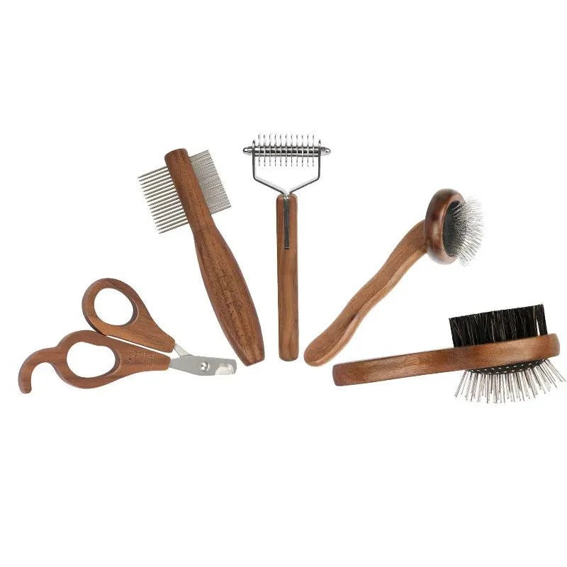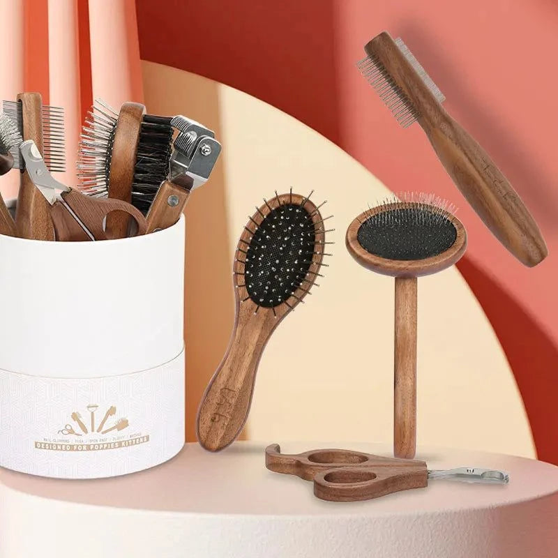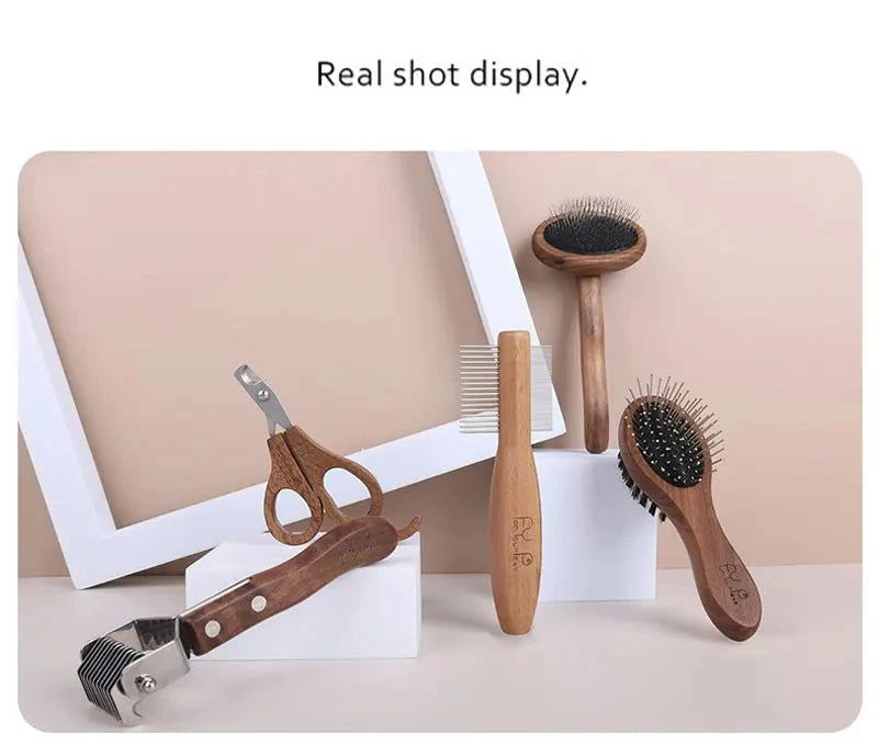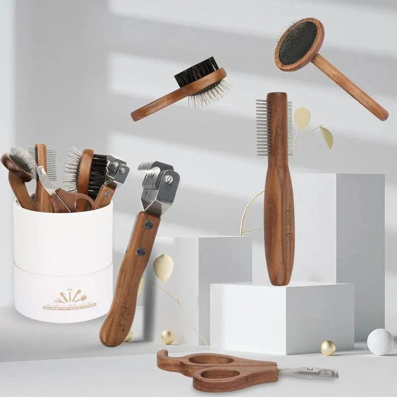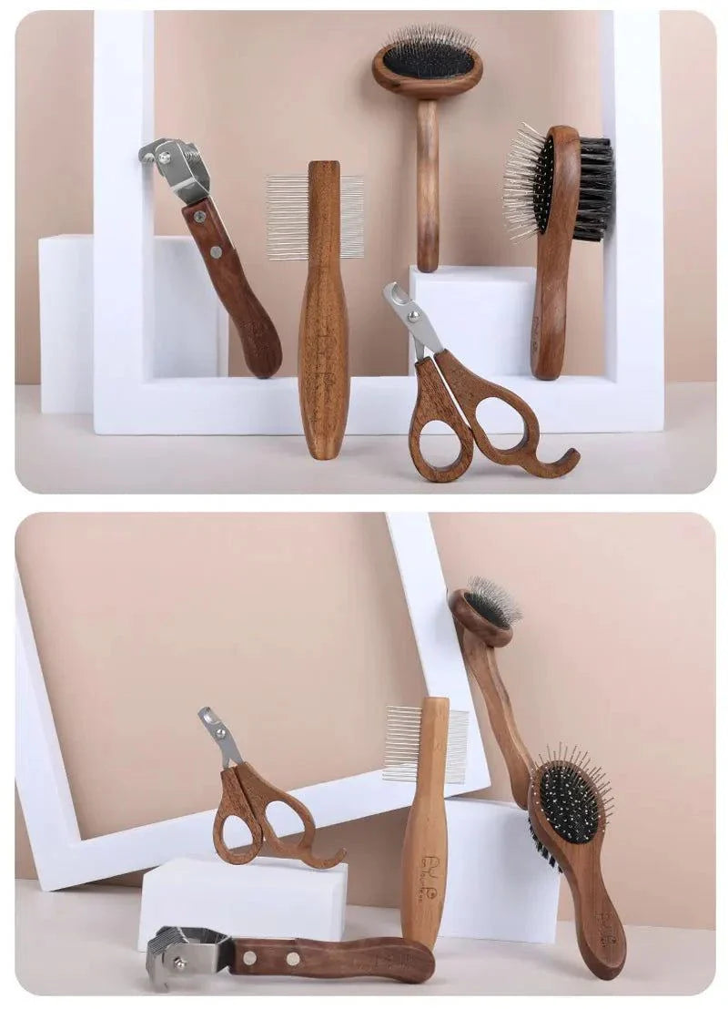 Sustainable Pet Grooming Set with wooden handles and easy-to-clean tools.