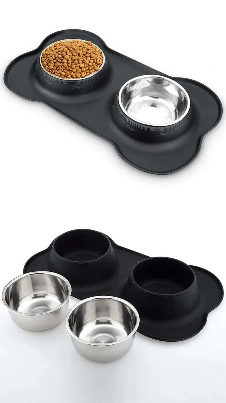 Anti-slip mat with durable stainless steel water and food feeder bowls for pets.