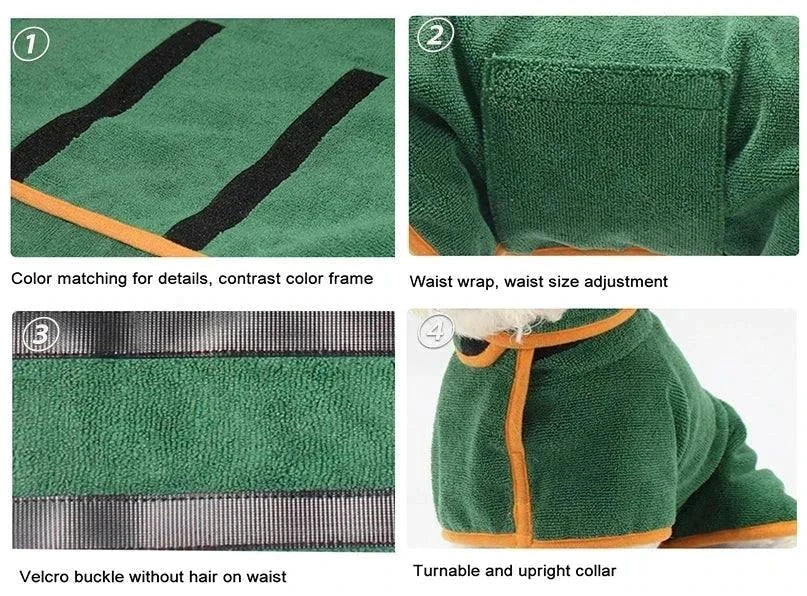 Quick-Dry Pet Bathrobe with microfiber, adjustable waist, Velcro buckle, and upright collar design for pets.