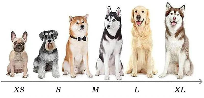 Size guide for Quick-Dry Pet Bathrobe, showing different dog breeds from XS to XL.