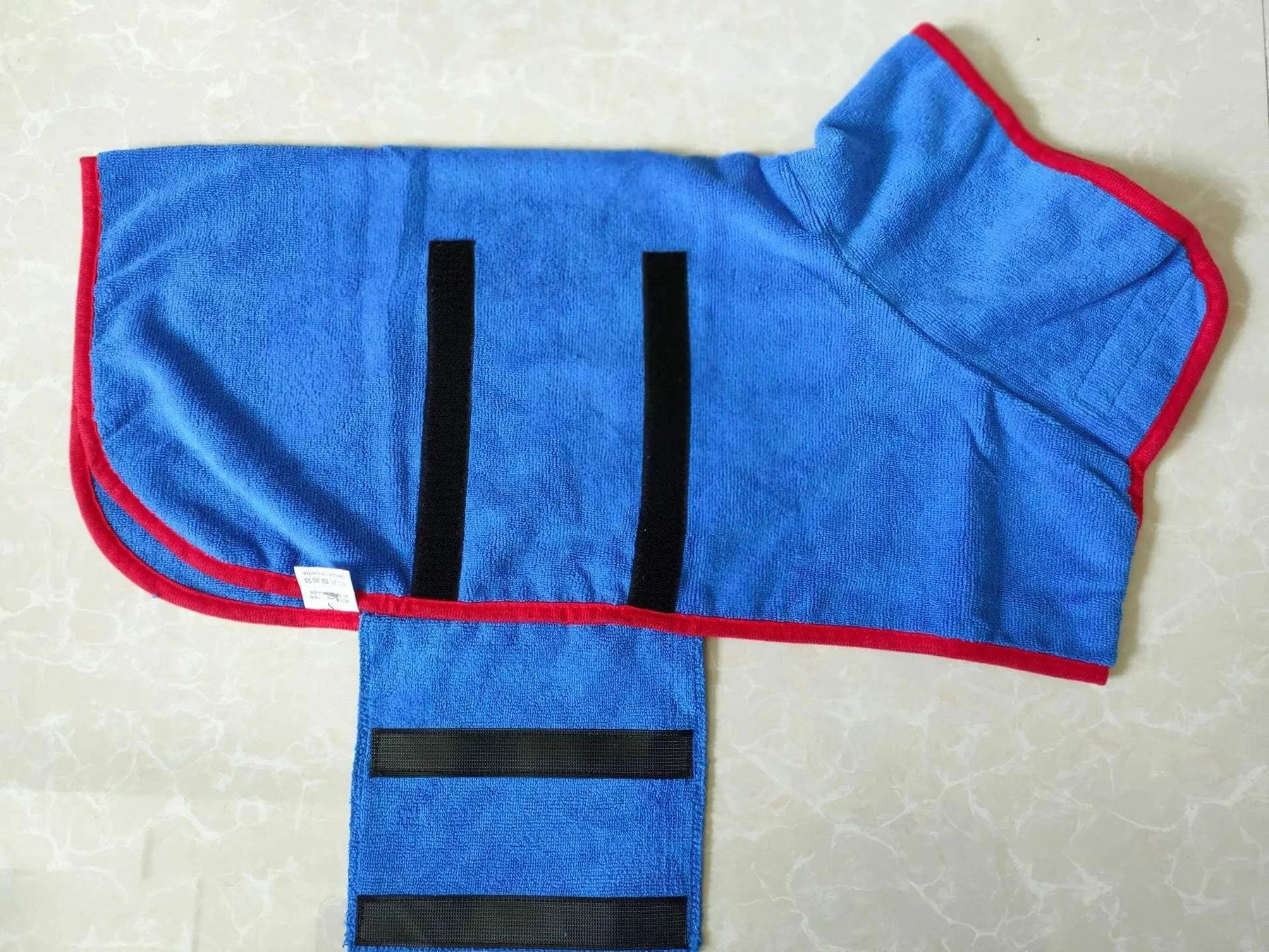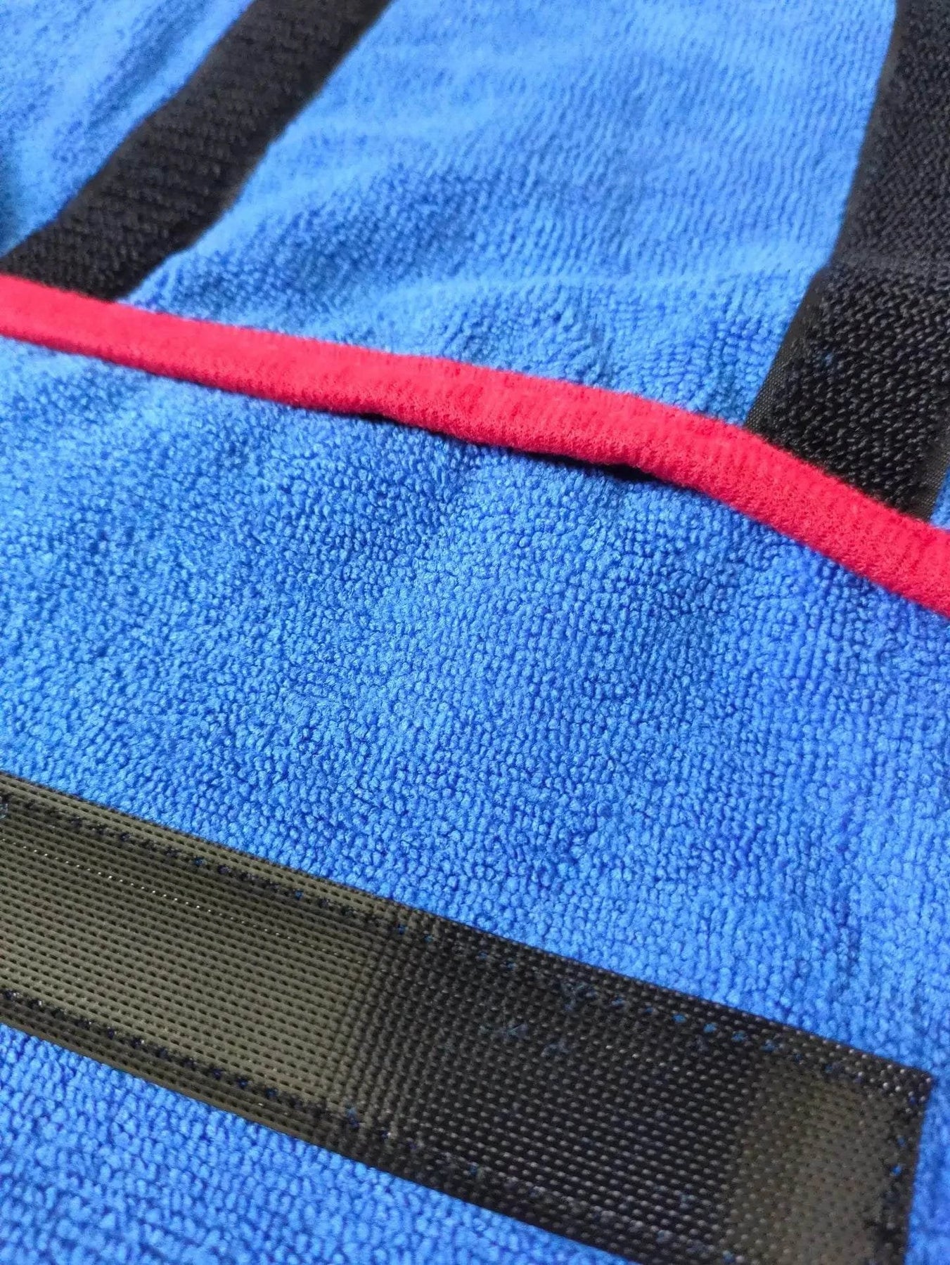 Blue microfiber quick-dry pet bathrobe with black and red detailing.