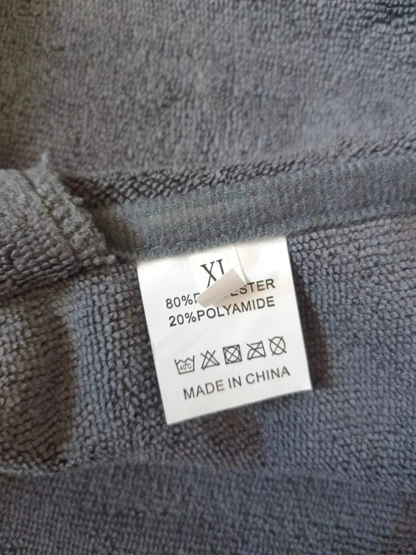 Quick-Dry Pet Bathrobe with microfiber fabric tag displaying composition and care instructions.