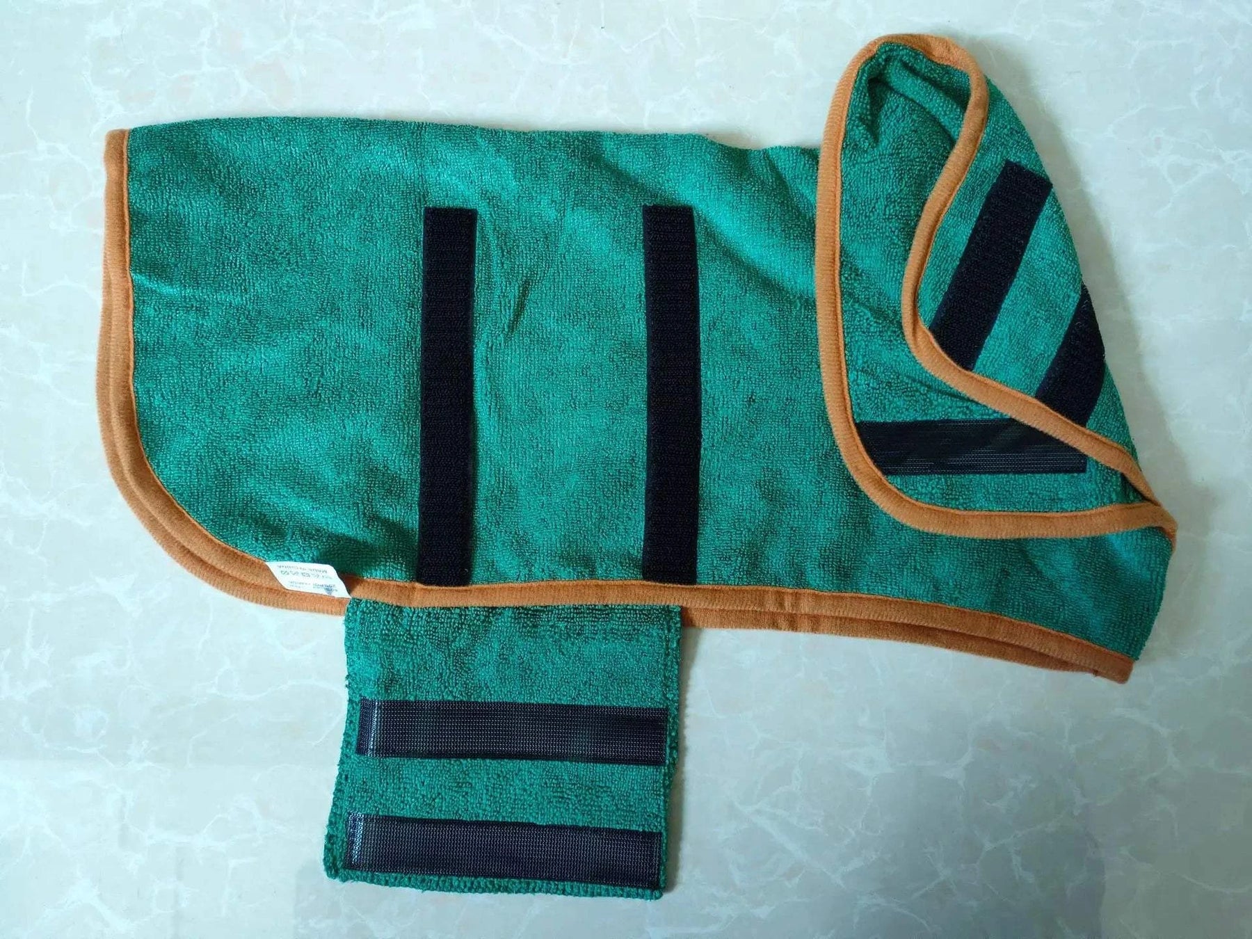 Microfiber quick-dry pet bathrobe for dogs and cats, green with orange trim.